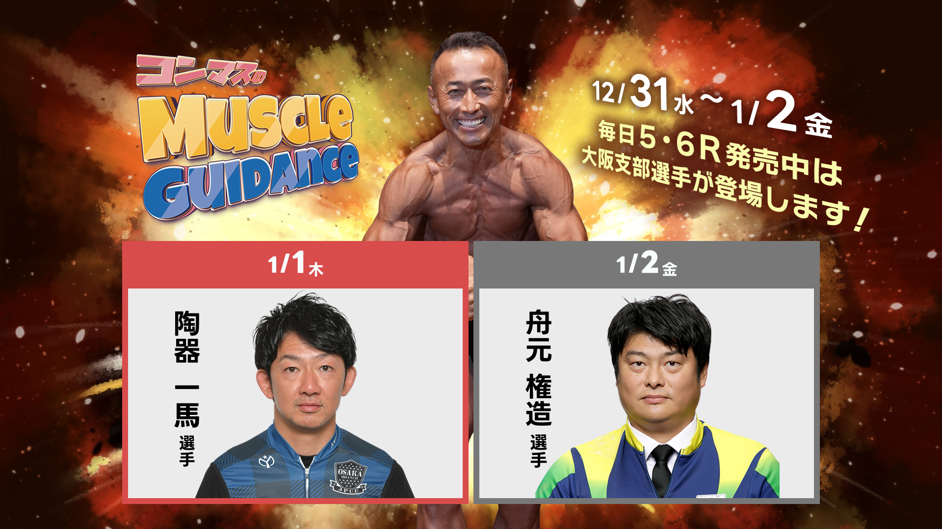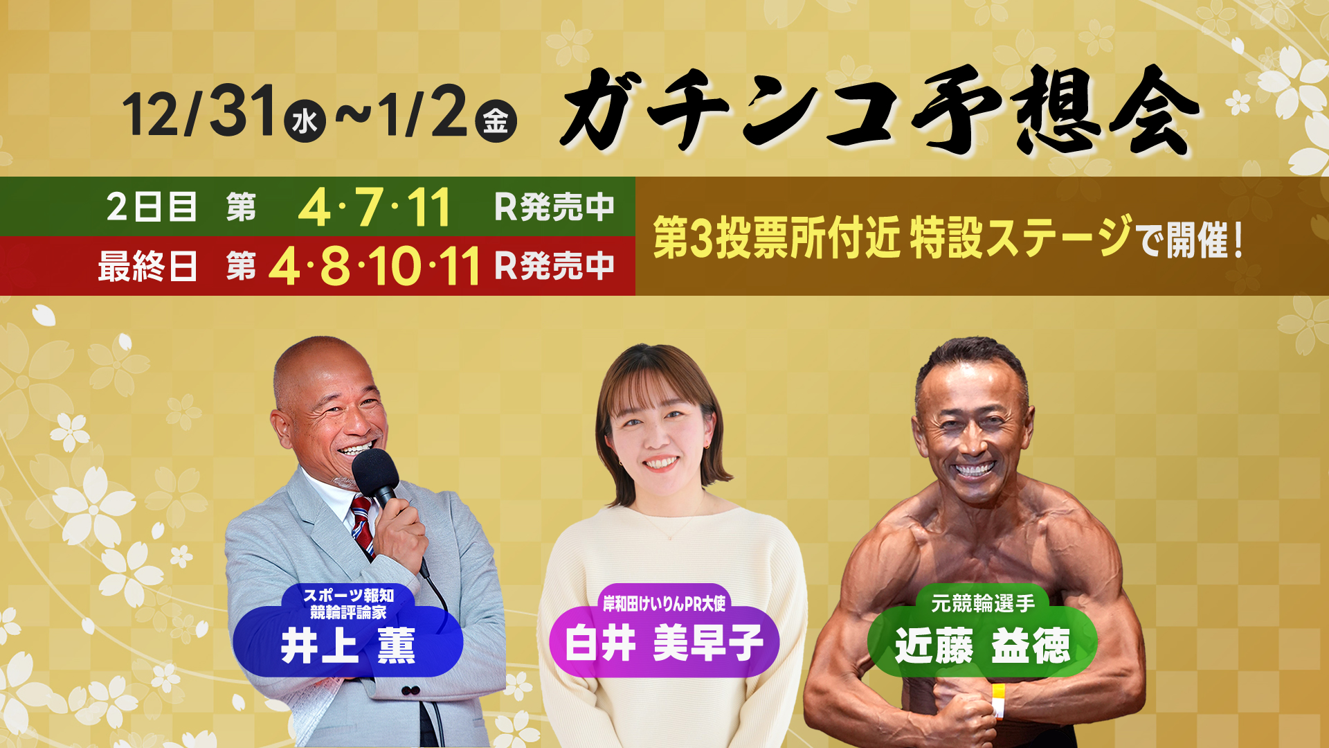 | 出演者 | 解説:井上薫、岡本新吾 MC:星野めぐみ ゲスト:白井美早子、大津尚之、中瀬由真(12/31,8R)、南修二(1/1,11R)、古性優作(1/1,11R)、舟元権造(1/2,8R)、高木真備(1/2.3R) 実況:大津尚之 |