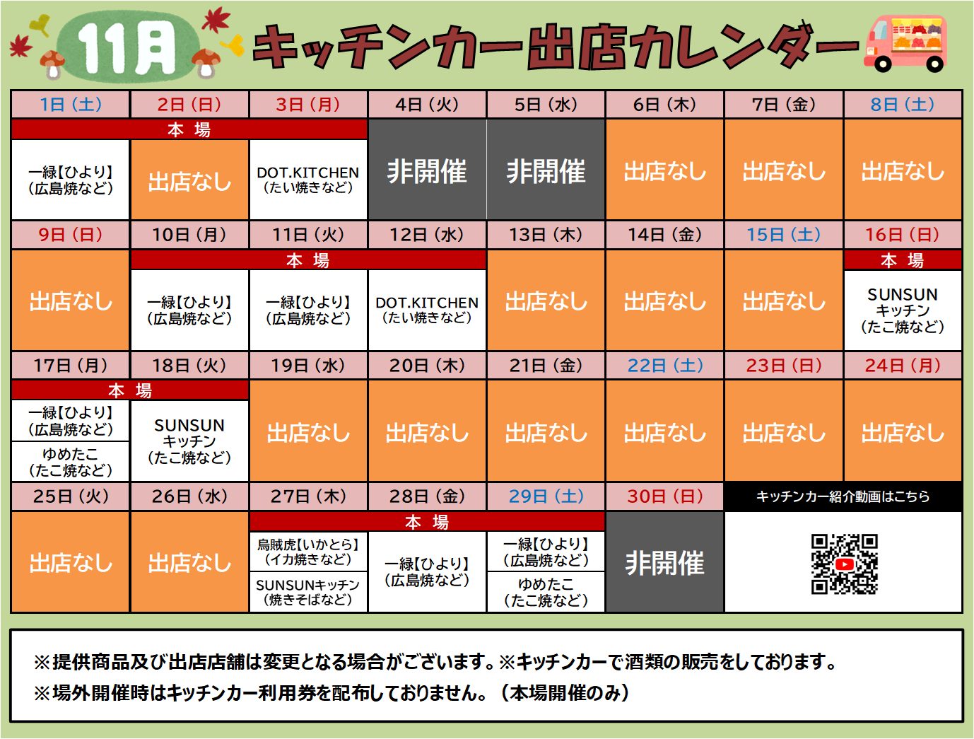 11月のキッチンカー出店カレンダーは以下の通りとなります。