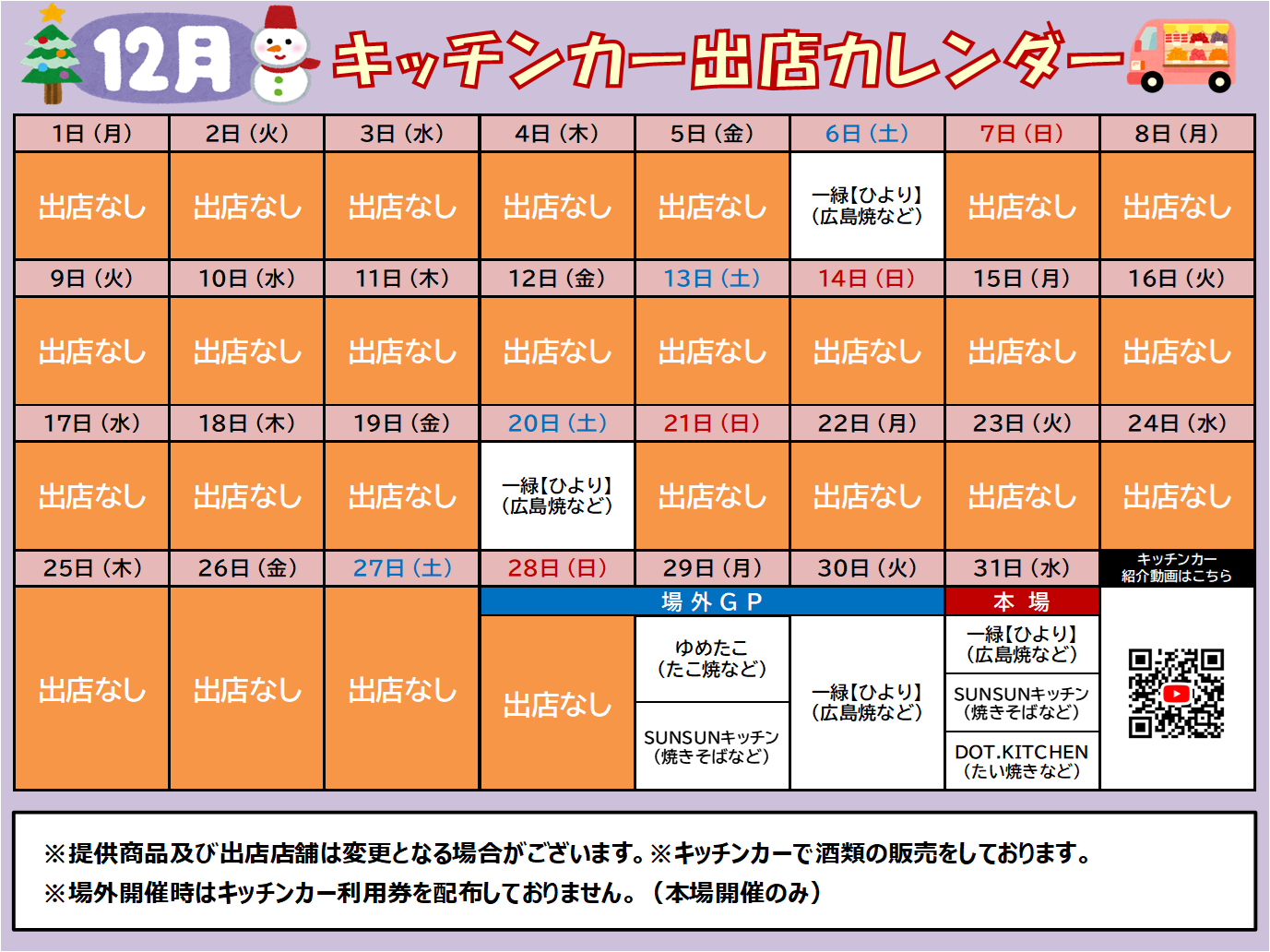 12月のキッチンカー出店カレンダーは以下の通りとなります。