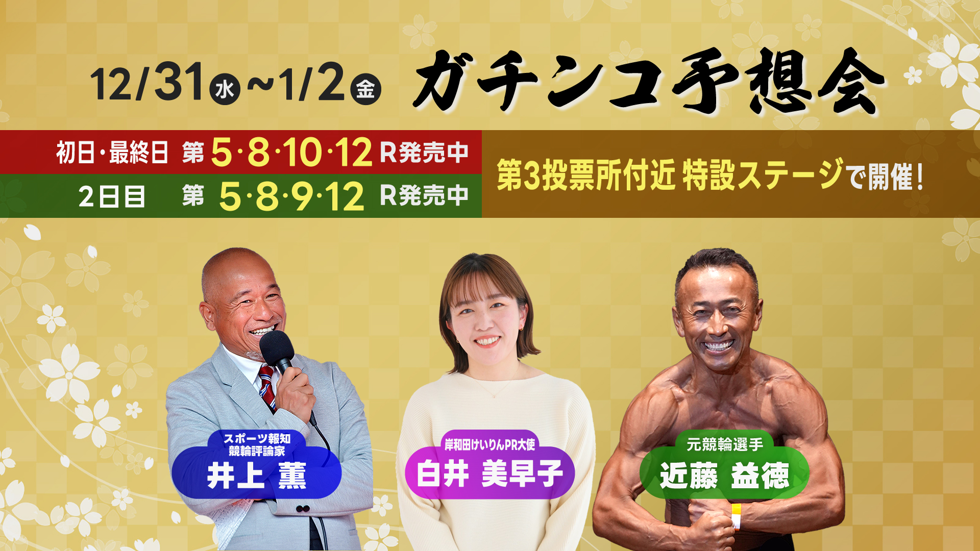 | 出演者 | 解説:井上薫、岡本新吾 MC:星野めぐみ ゲスト:白井美早子、大津尚之、中瀬由真(12/31,8R)、南修二(1/1,11R)、古性優作(1/1,11R)、舟元権造(1/2,8R)、高木真備(1/2.3R) 実況:大津尚之 |